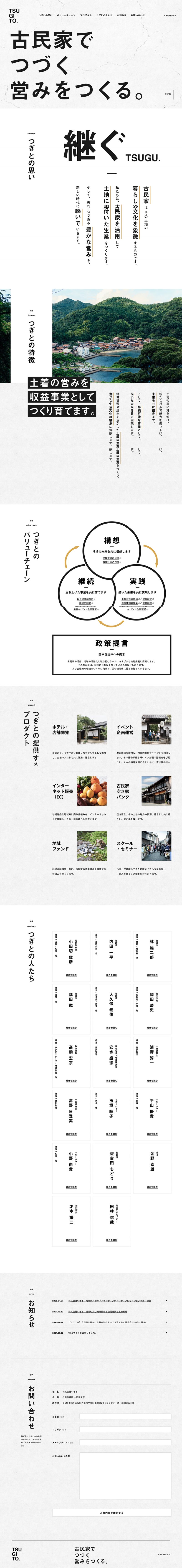 暮らしや文化を象徴する「古民家」を活用して、その土地に根付いた生業をつくる事業を行う「つぎと」。 まだ設立したばかりの彼らの伝えたい想い、目指したい世界を宣言するコーポレートサイトを制作しました。 https://tsugito.co.jp/ Client: 株式会社つぎと
